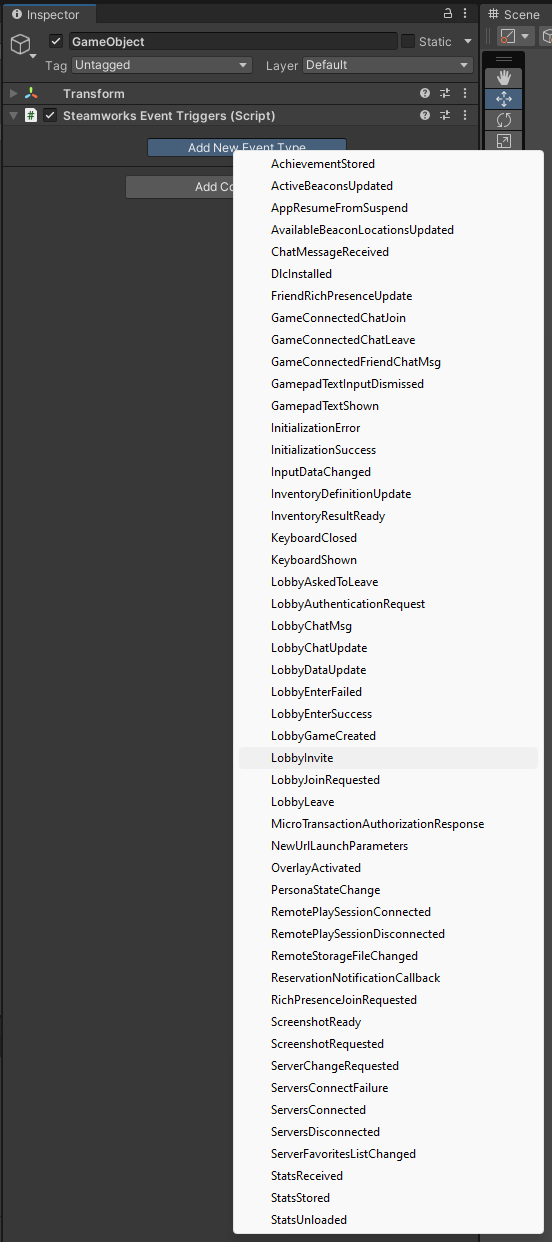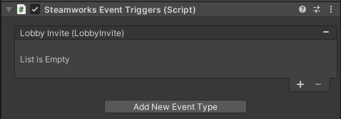 The Steamworks Event Triggers component works similarly to Unity's Event Trigger component letting you easily connect to any Steamworks SDK static event quickly and easily. There is no reason to use this component in C# code as all of these events are available on their respective API extensions. This component exists only to expose those events to the Unity Inspector.