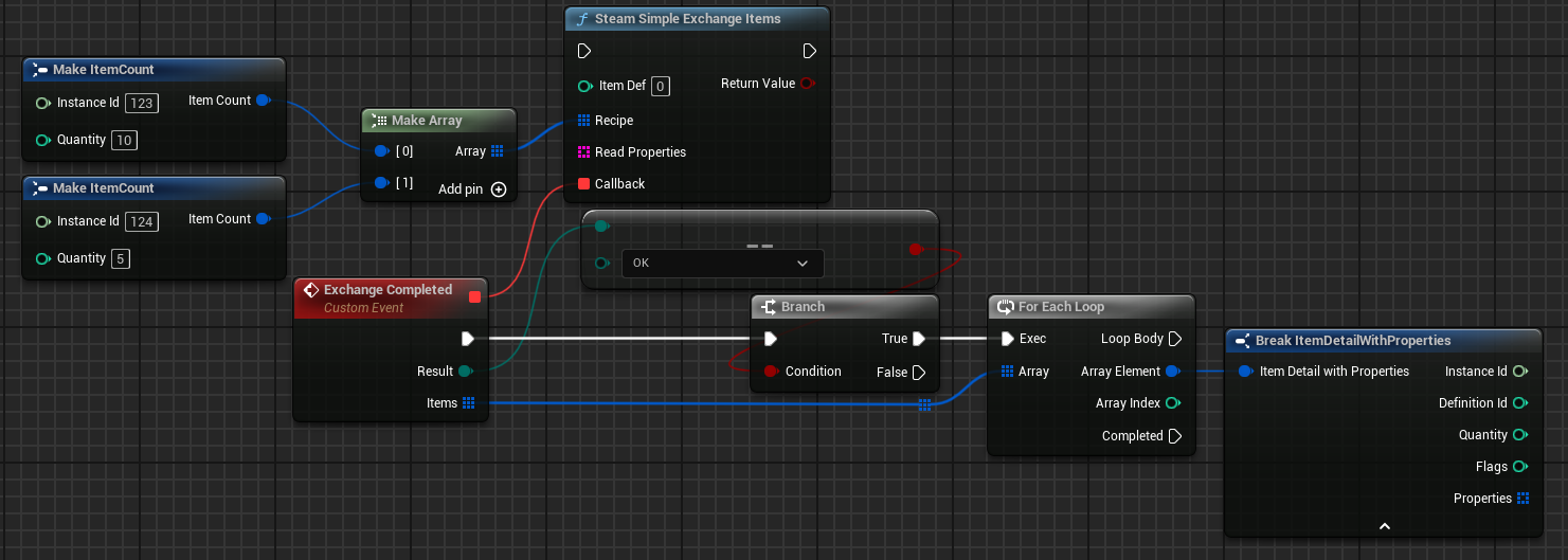 [Exchange Items](https://kb.heathen.group/old-kb/old-toolkit-for-steamworks/unreal/blueprint-nodes/functions/exchange-items) lets you pass in an array of [Item Count](https://kb.heathen.group/old-kb/old-toolkit-for-steamworks/unreal/blueprint-nodes/types/item-count) to exchange for a given item. The callback works much like the [Get All Items](https://kb.heathen.group/old-kb/old-toolkit-for-steamworks/unreal/blueprint-nodes/functions/get-all-items) discussed in the [Inventory](https://kb.heathen.group/old-kb/steam/inventory) article.