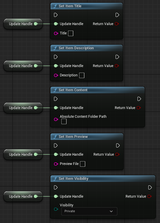 This process lets you update an existing Published File. You do this by calling "Start Update", which provides you with an update handle. You can then set each field of the item, such as Name, Description, Preview Image, and so on, and finalise the update with Submit item update.